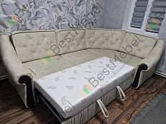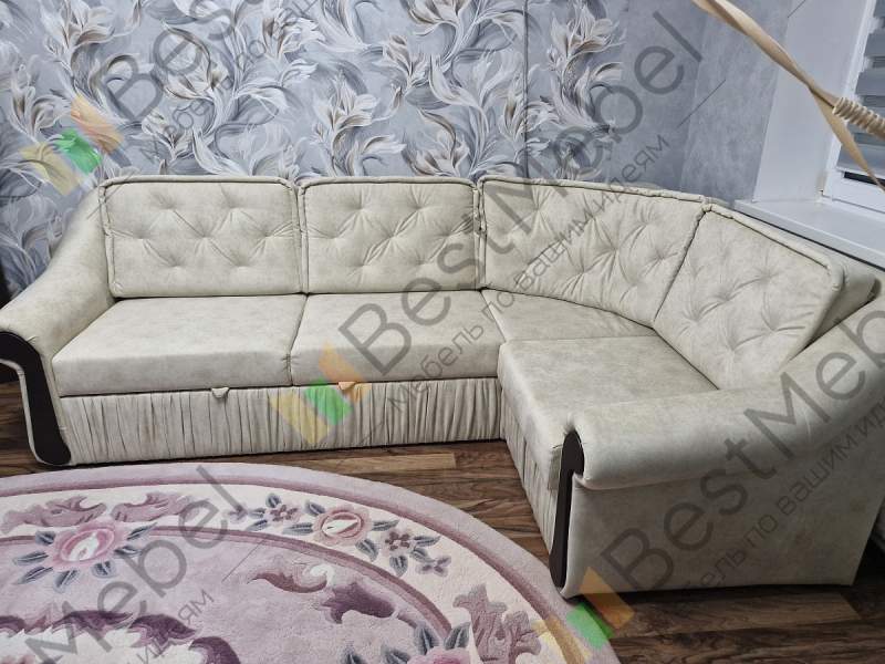 Угловой диван раскладывается под спальное место. Есть ящик для белья. К спинке дивана подушки крепятся на молнии. Спальное место выдвигается при помощи механизма "дельфин". При заказе можно изменить размеры и цвет обивки.