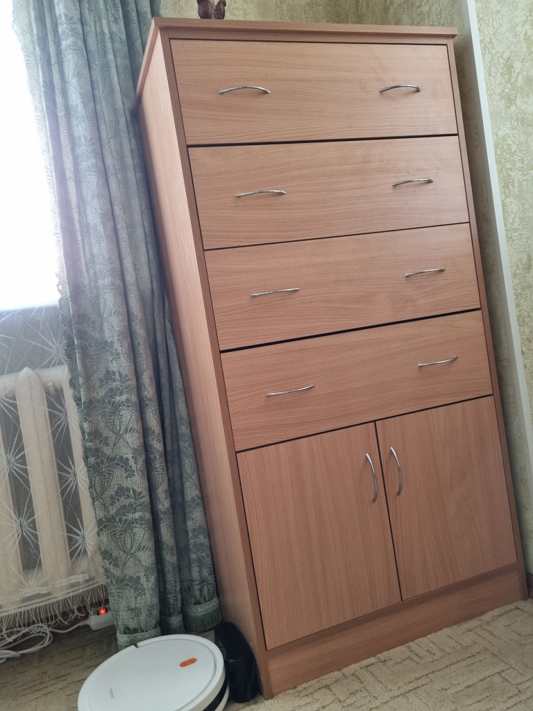 Всем доброго времени суток! Случайно наткнулся на этот комод и эту компанию во время поиска мебели в интернете, искал себе что-то похожее на "шкаф-комод". Очень зацепило, то что прямо на сайте можно выбирать многие размеры и параметры мебели. А в 3D режиме смотришь как будет выглядит мебель в разных расцветках. Определился с размерами и параметрами, разместил Заказ 00000353924. Через 10 минут со мной уже связался менеджер, уточнил параметры которые я немного изменил, уточнил адрес и уже назначил доставку на 4 день, что меня очень удивило, так как мебель под индивидуальные параметры обычно изготавливается гораздо дольше. Доставка до подъезда бесплатная, что очень тоже порадовало.Теперь о негативном.1. Негатив начинается уже со сборки. Отсутствует схема сборки, в моем случае был только чертеж, без каких либо параметров(просто картинка мебели). Но наклейки на каждой детали мебели, компенсируют отсутствие схемы.2. "Пакет с фурнитурой" - это конечно прикол... все саморезы(разных размеров), винты, гвозди и тд, всё это в одной куче, я уже не говорю о том что нигде не указано, какой и куда предназначается, но то что при сборке теряешь до 30 минут времени что бы перебрать всю фурнитуру по кучкам и по пакетикам, что бы облегчить потом поиски при сборке... Ну неужели пакетики такие дорогие, что бы разделить это всё?После завершения сборки мебели, в моём варианте исполнения, обнаружилось несколько проблем.1. Так, как я заказал с изменением конструкции, со шкафом в верхней части комода и общая высота 1650, от веса начали разъезжаться стойки на 1-2мм в сторону, из-за чего начали выпадать из рельс центральные выдвижные ящики. Спустя 1.5-2 недели, мне бесплатно довезли две царги для стяжки, которые я установил в центральную часть комода и проблема ушла.2. Заказал два выдвижных ящика с дополнительными разделёнными ячейками(6 ячеек). Их можно выбрать прямо с сайта, во время конфигурации мебели. Две дальние ячейки практически не доступны, так как ящик выдвигается не до конца, остается доступ к ячейкам в 3-4 сантиметра. Считаю это технический недочет проектировщиков. Что бы это исправить мне предложили либо переделать полностью ящики за мой счёт с немного другим расположением ячеек, либо докупить специальные направляющие с полным выдвижением. Тут я конечно удивился, что этот косяк повесили на меня. Потому что на сайте нет ни какой информации, схем и чертежей на этот счет, как это будет выглядеть изначально не мог знать и даже не предполагал что такое может быть. Ящики так и остались неисправленными, пользуюсь пока так.3. Дверцы шкафчика. После регулировки, с каждой стороны имелся зазор почти в 5мм, что очень выглядело нелепо. Щели такие что можно было разглядеть содержимое шкафа. Долго спорил с гарантийным отделов, в итоге признали гарантийным случаем и поменяли дверцы бесплатно. Новые дверцы, каждая шире на 2-2.5мм, в итоге отрегулировал на стандартный зазор в 3мм.4. Пол шкафчика. На чертеже не разглядел, что он утопленный, по отношению фасада выдвижных ящиков и шкафчика дверей, а фасад не укрывает эту щель. Это смотрелось очень не красиво, в связи с этим мне пришлось докупать отдельно эту деталь, которая стоила дополнительно 850р. Косяк признали за мной, так как я не разглядел чертеж, несмотря на то, что на сайте выглядит это по другому.Так же забыли положить подпятники, но их довезли вмес