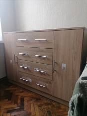 Выбирала не очень дорогой комод в столовую Удобный-сложила все мелочи, мелкую посуду, и сверху еще вместились кухонная мелкая техника. Выбирала по размеру и цвету, всё подошло идеально. Ящики выдвигаются хорошо. Запаха нет, дверцы не скрипят, поверхность приятная на ощупь.Всё устроило, довольна. Сборку заказывала, всё сделали быстро и аккуратно.