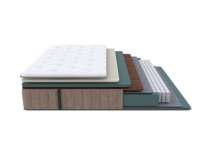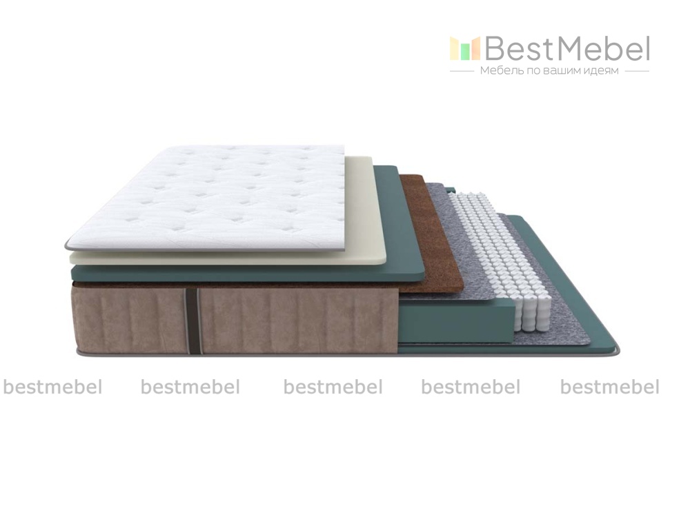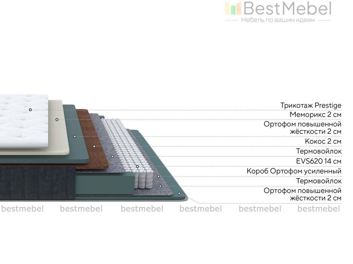 Состав: Меморикс 2см Ортофом (ППУ) с эффектом памяти) \ Ортофом (ППУ) повышенной жестоксти 3 см \ Кокос 2см \ Термовойлок \ EVS620 14см \ Термовойлок \ Ортофом (ППУ) повышенной жесткости 2см \ Короб усиленный (ВППУ).