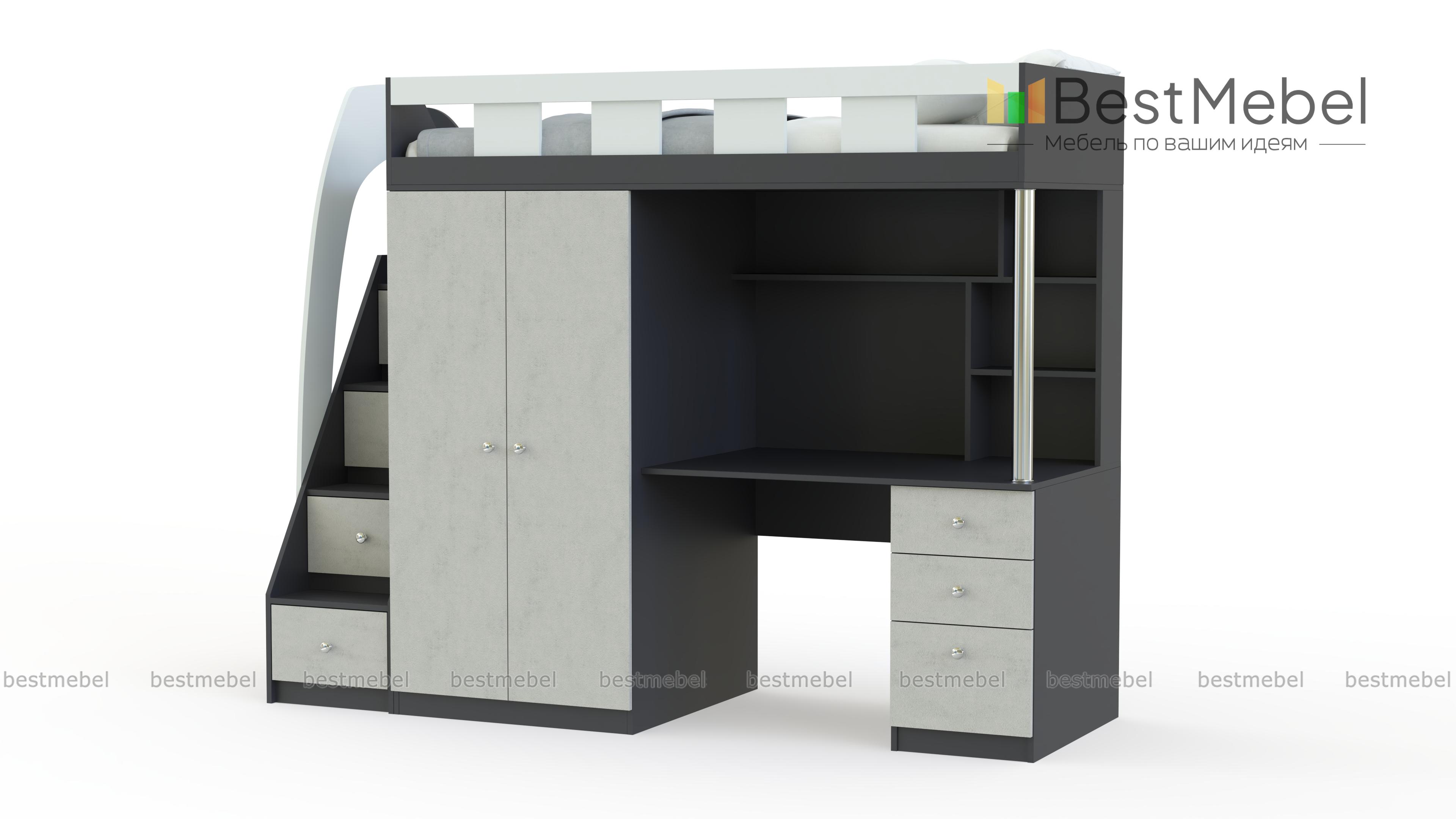 Кровать-чердак с рабочей зоной Клаус 13 BMS станет практичным решением для экономии пространства детской. На втором ярусе располагается просторное спальное место с бортиком, а первый занимают рабочая зона с письменным столом и полками, распашной шкафчик для одежды и лестница-комод с ящиками для игрушек и прочих вещей ребенка. Корпус светлых тонов дополняют цветные фасады, углы кровати безопасно скруглены. Купить кровать-чердак с рабочей зоной Клаус 13 BMS приглашаем в наш интернет-магазин.