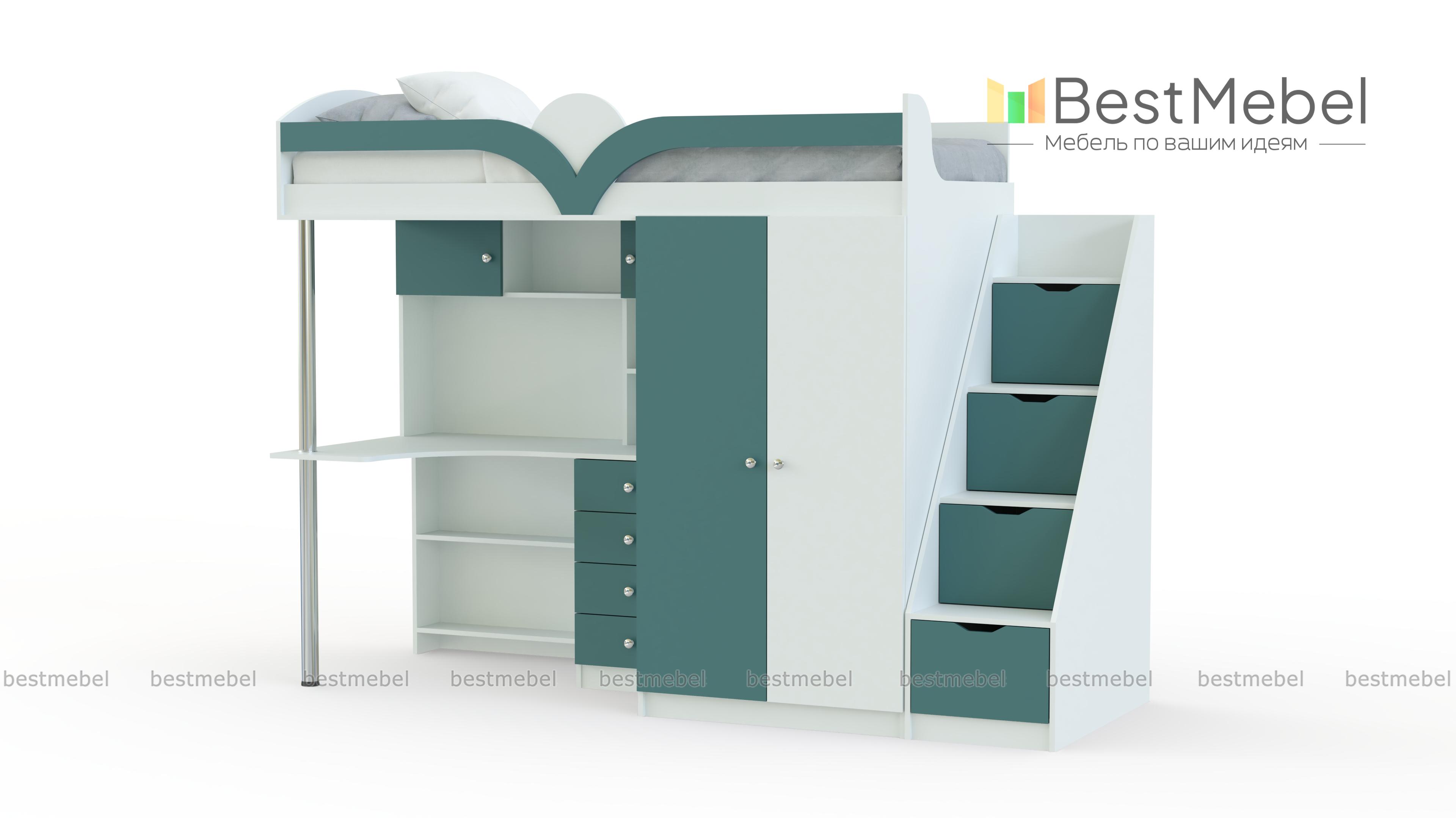 Кровать-чердак с рабочей зоной Мираж К-32 BMS предназначена для меблировки малогабаритных квартир и включает в себя все необходимое ребенку для полноценного отдыха, учебы и хранения вещей. Многофункциональный комплект состоит из кровати с защитным скругленным бортиком, лестницы-комода, распашного платяного шкафа и рабочей зоны со столом, тумбой и надстройкой с полками. Корпус светлых древесных тонов сочетается с контрастными фасадами. Купить кровать-чердак с рабочей зоной Мираж К-32 BMS вы сможете в нашем интернет-магазине, подобрав цветовое решение.