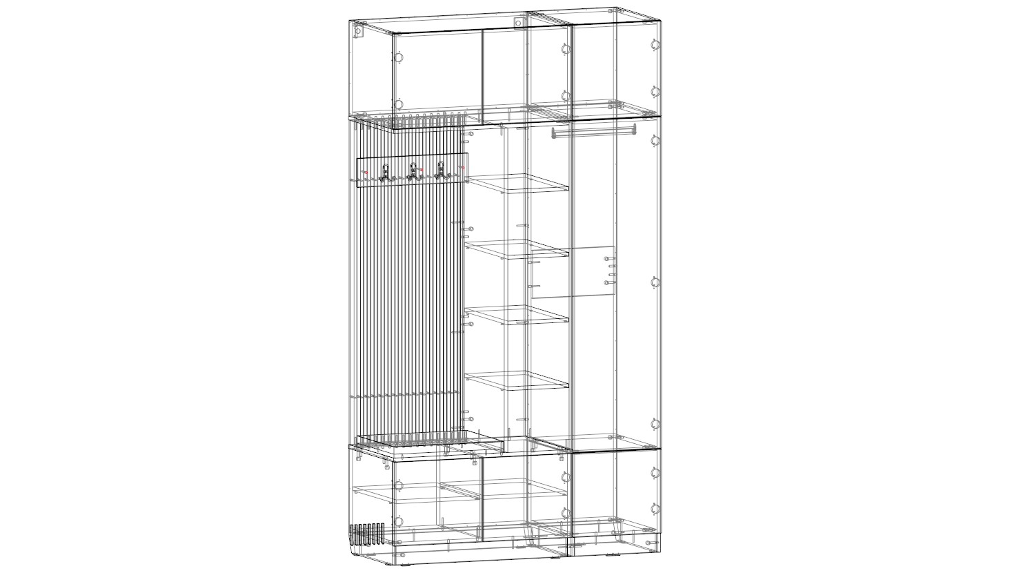Прихожая Дублин 28 BMS воплощает в себе простоту и функциональность, присущие минимализму. В этой небольшой прихожей предусмотрены крючки для одежды и закрытое отделение со штангой, стеллаж под мелкие вещи, обувные и антресольные секции, а также мягкое сиденье. Декоративную роль играют вертикально расположенные панели открытой вешалки. Зеркальное отражение, выпил под плинтус 7*3, монтаж скрытый.