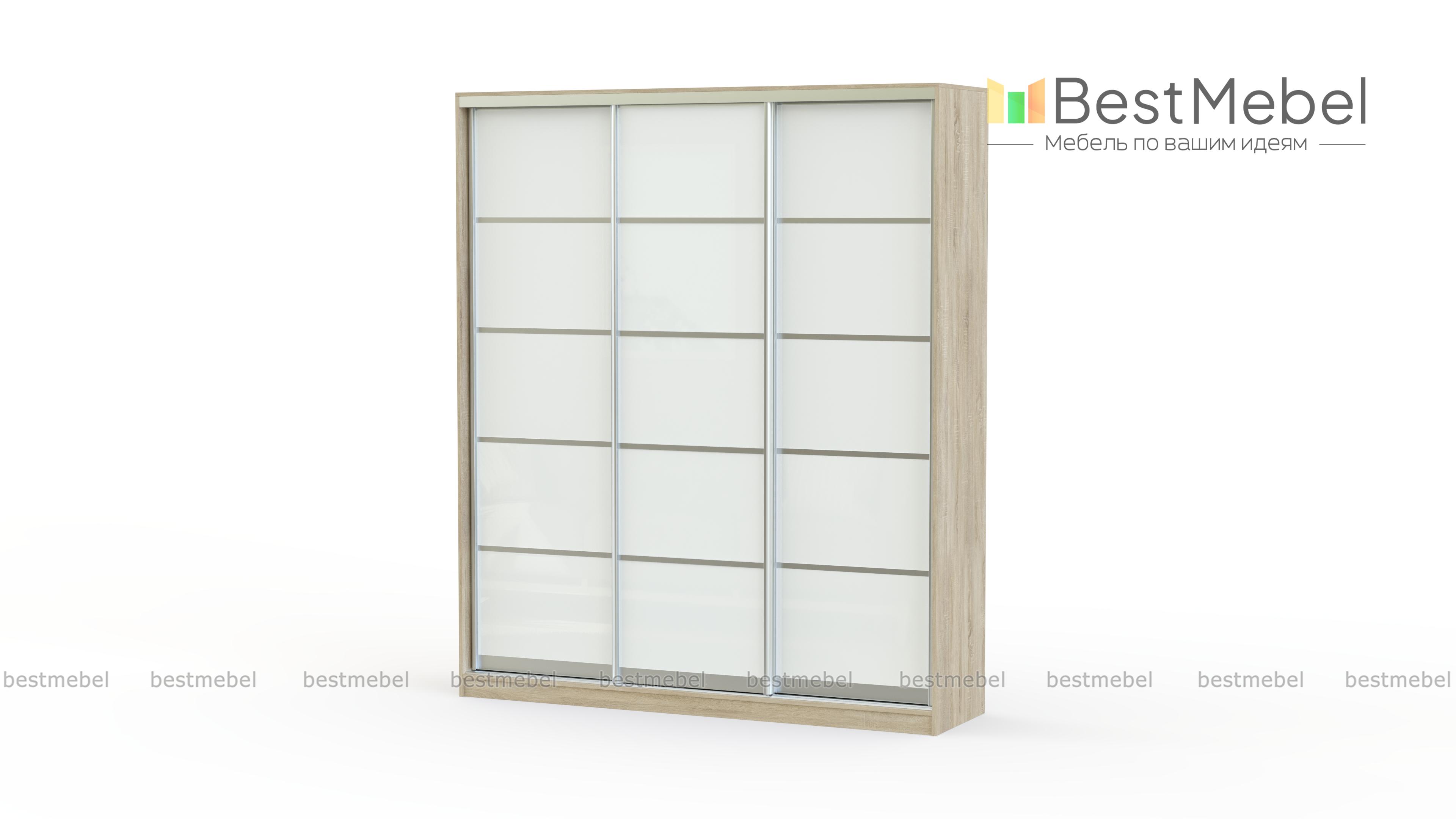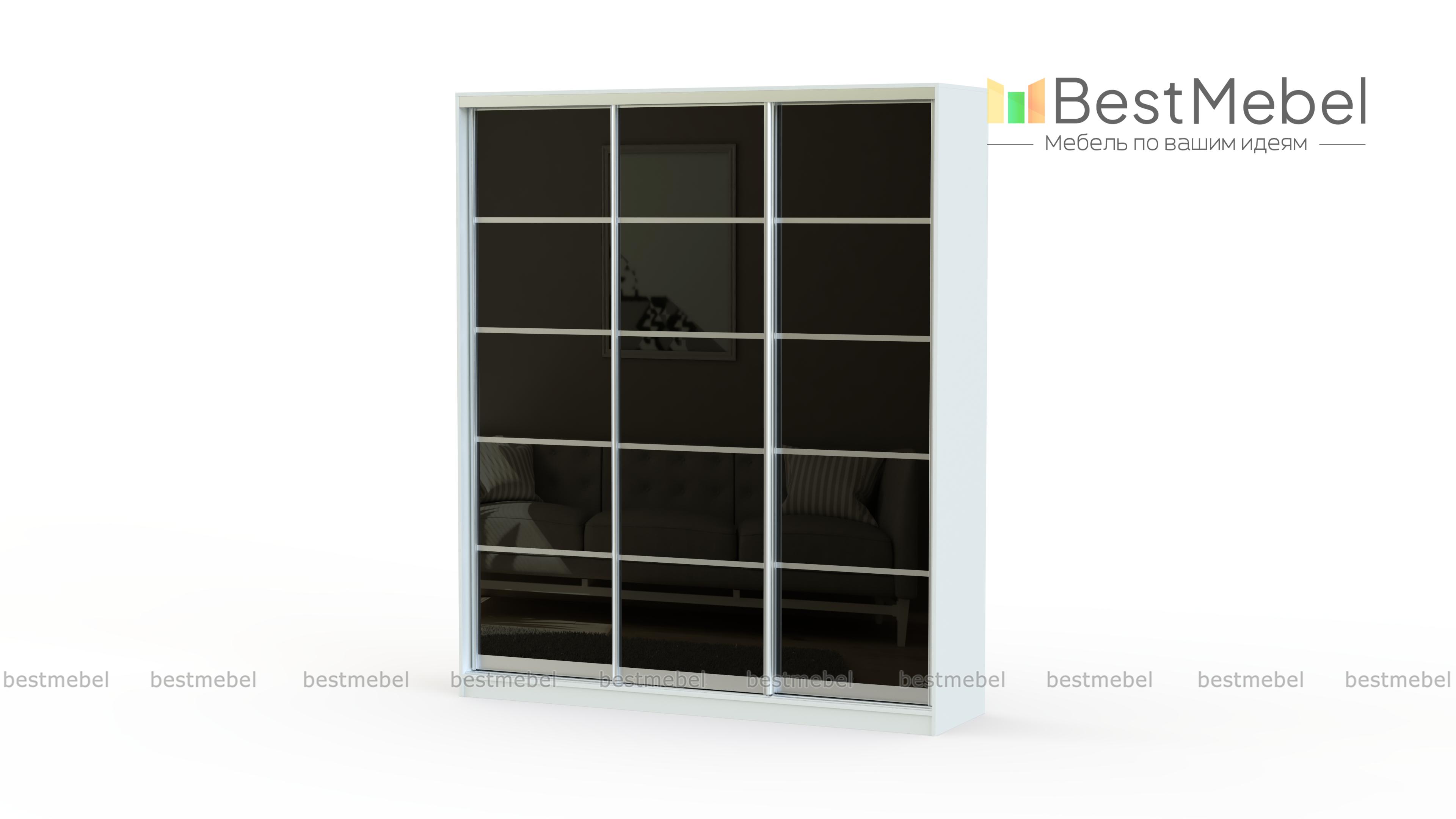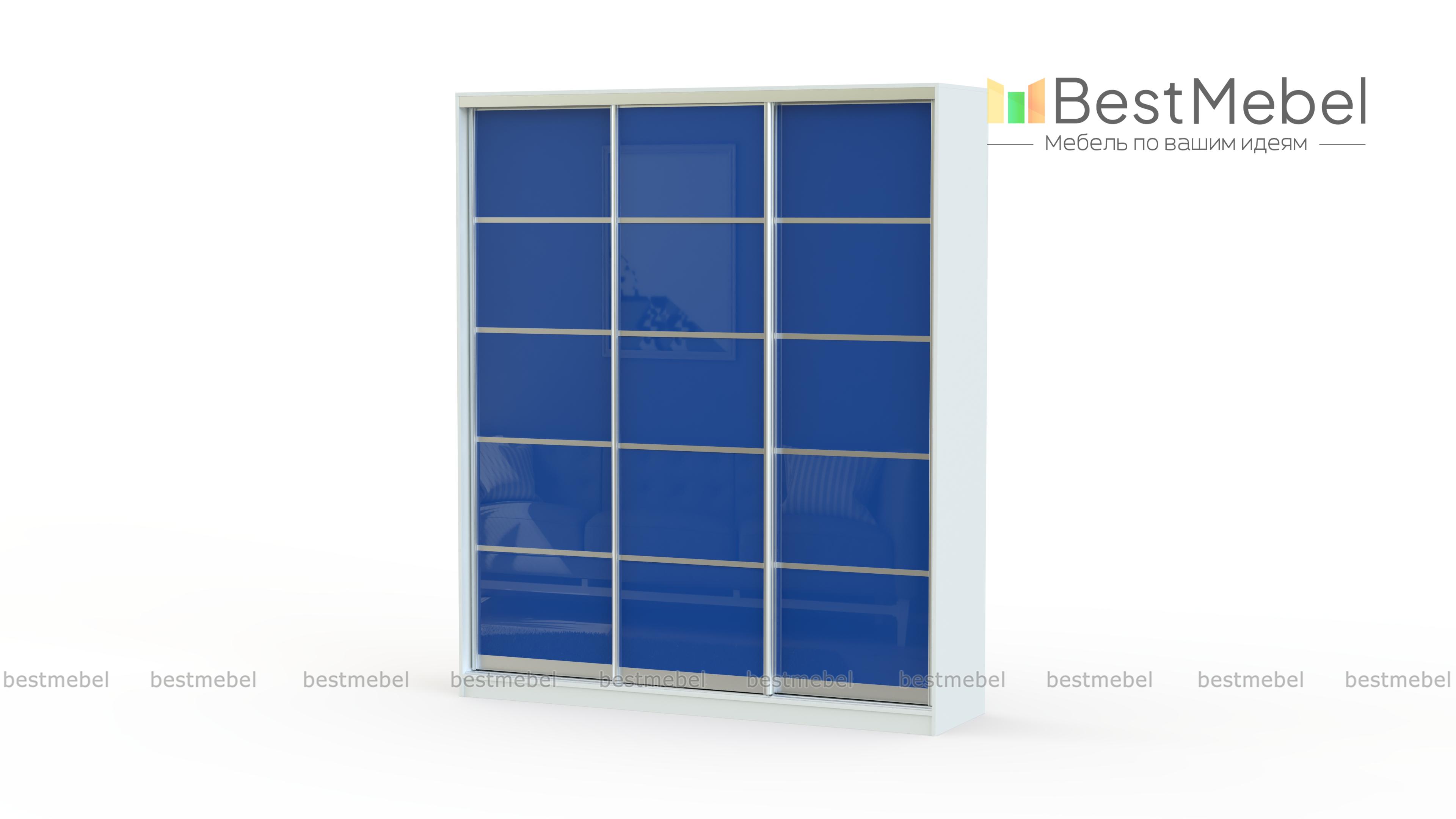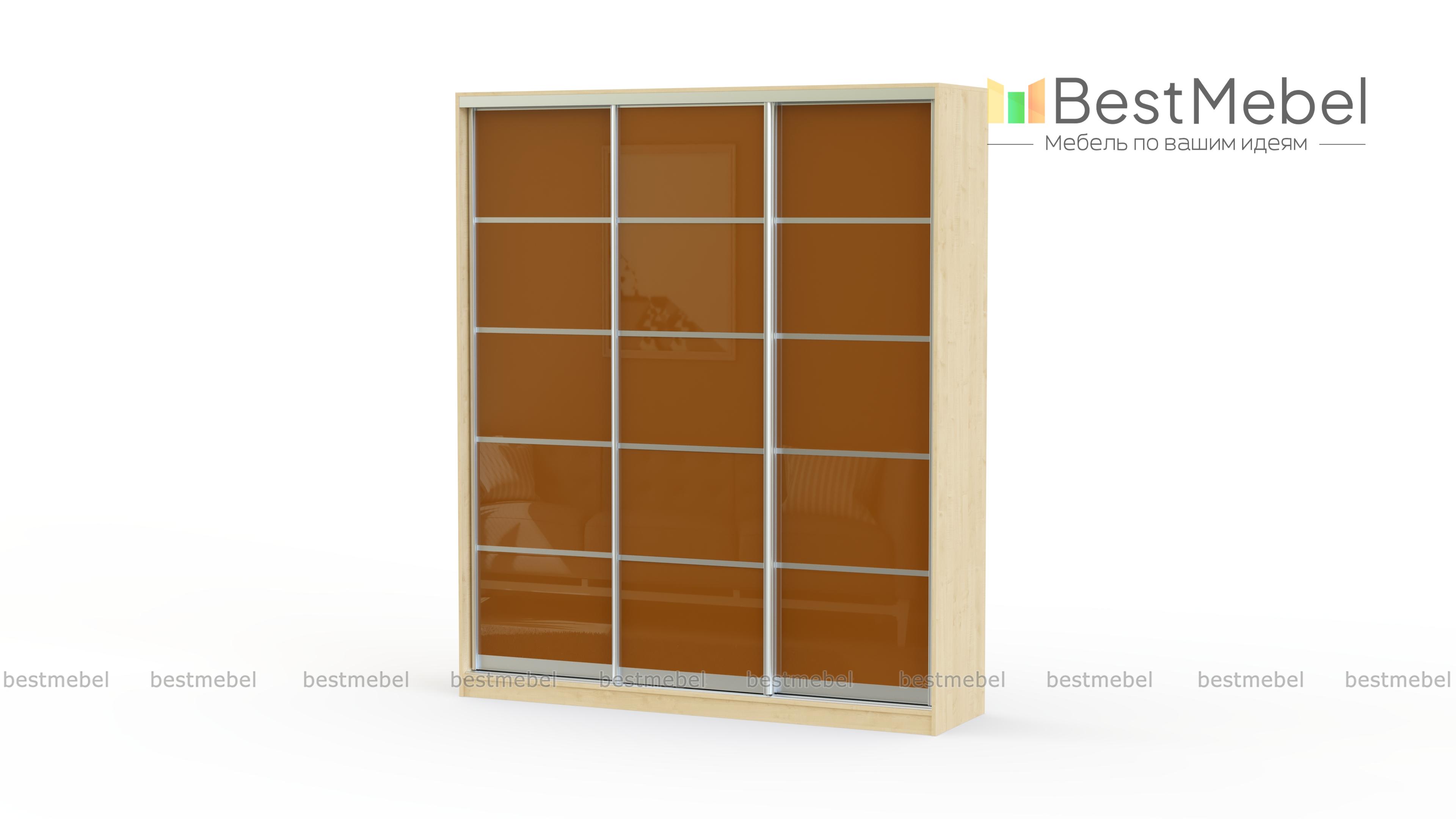 Шкаф-купе Гранат BMS имеет три раздвижные двери, декорированные цветным стеклом гранатового оттенка. Прочный алюминиевый профиль делит каждую створку на пять равных прямоугольных сегмента, создавая простые геометрические формы. Такой дизайн шкафа отлично впишется в любой интерьер, придавая ему оригинальности. Внутреннее наполнение по умолчанию сочетает в себе вместительные полки и отсек для хранения одежды на штанге при помощи вешалок.