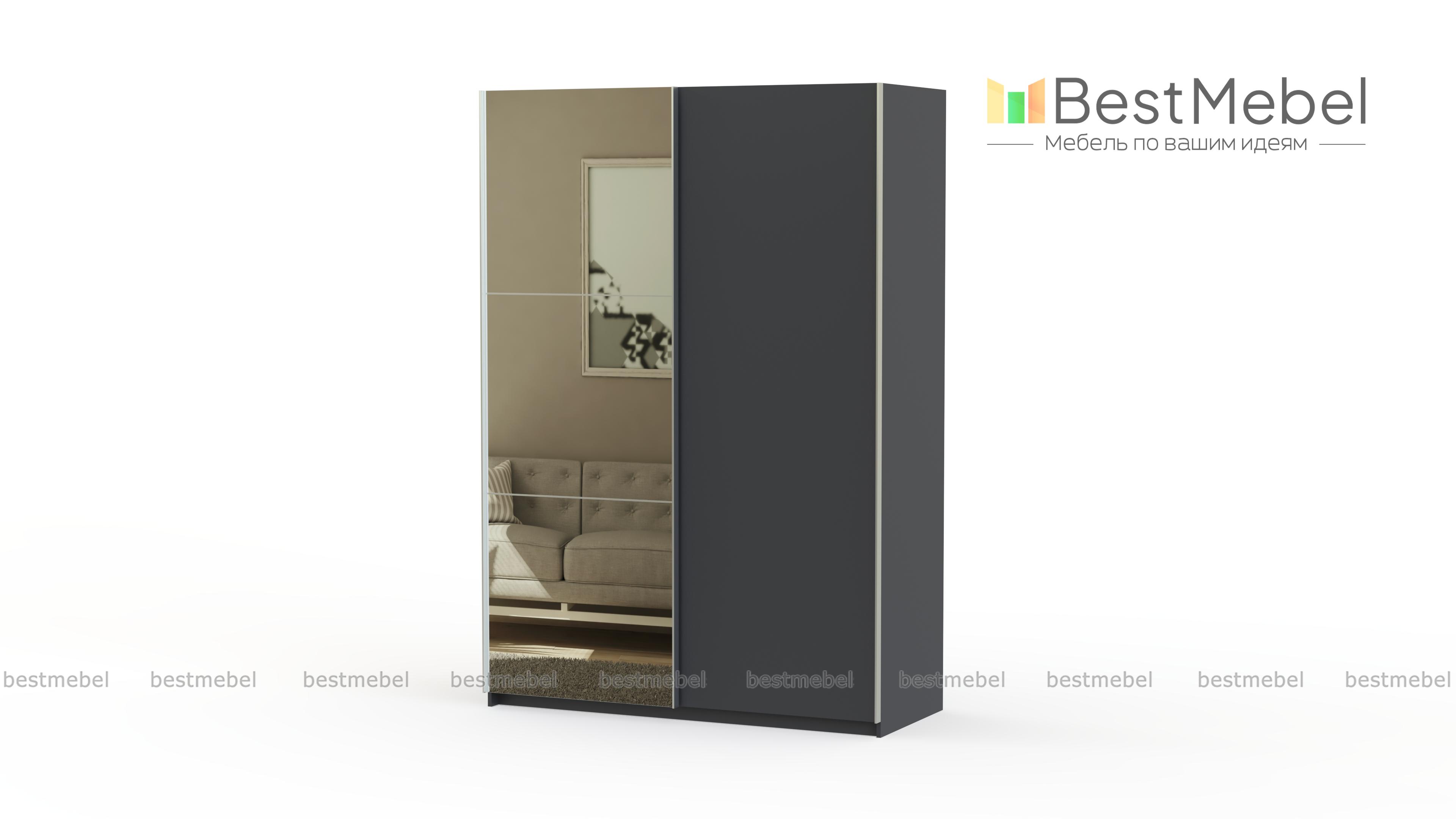 Ультрасовременный шкаф-купе с оригинальным дизайном. Светлый фасад и зеркала делают конструкцию визуально легкой и не громоздкой. Шкаф изготовлен из ламинированного ДСП, которое не подвержено действию механических повреждений, стойкое к влаге и простое в уходе.