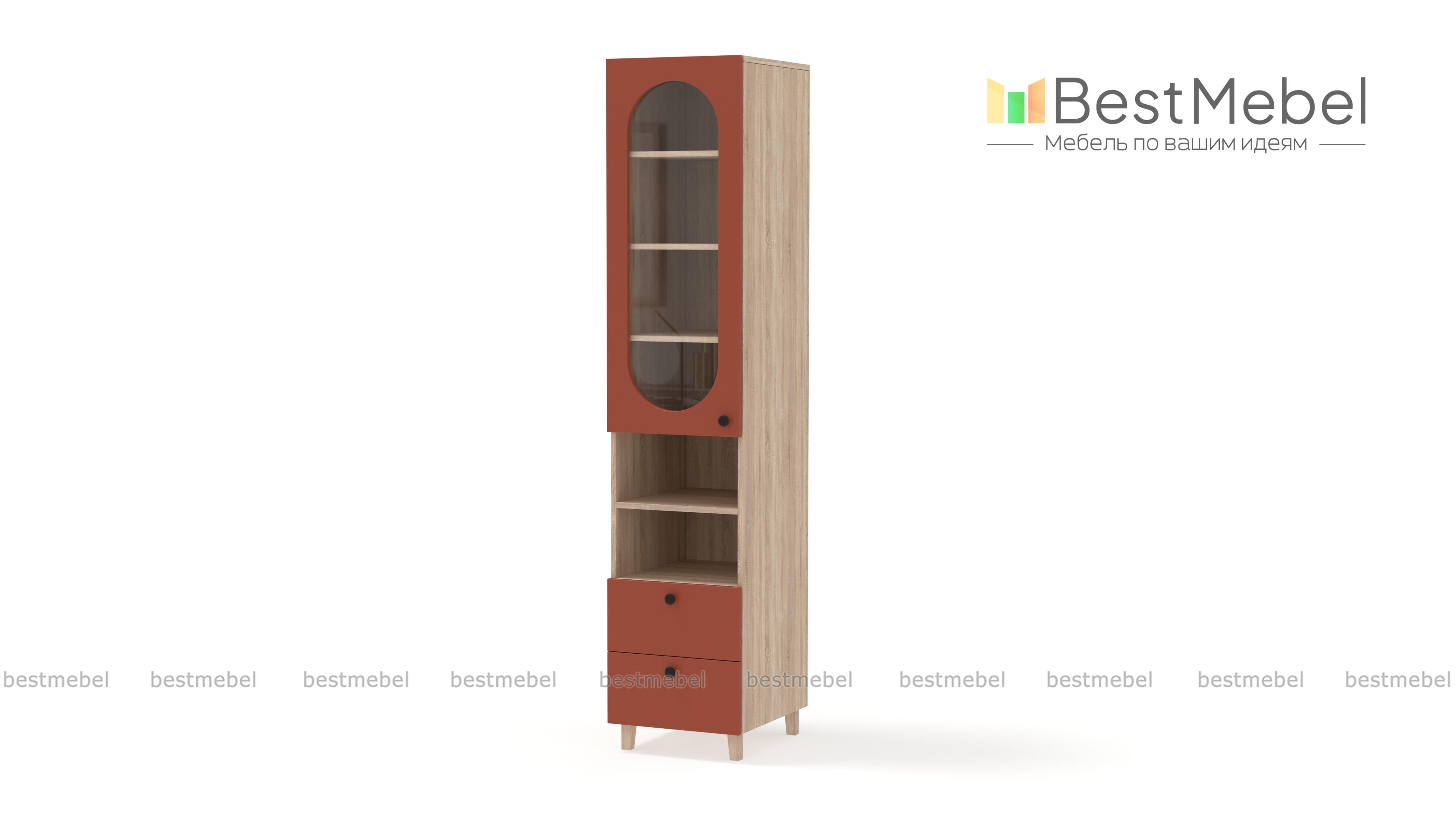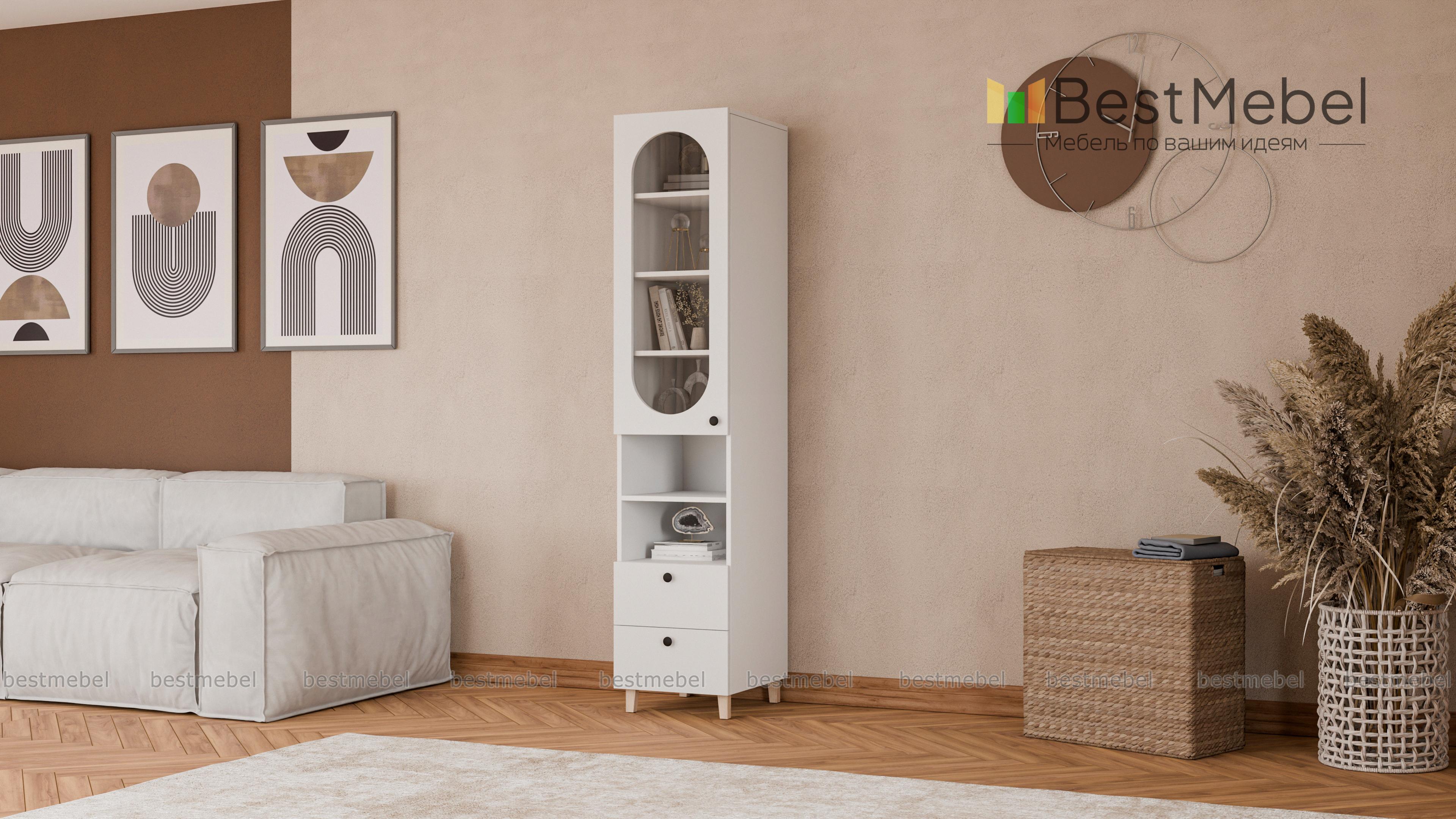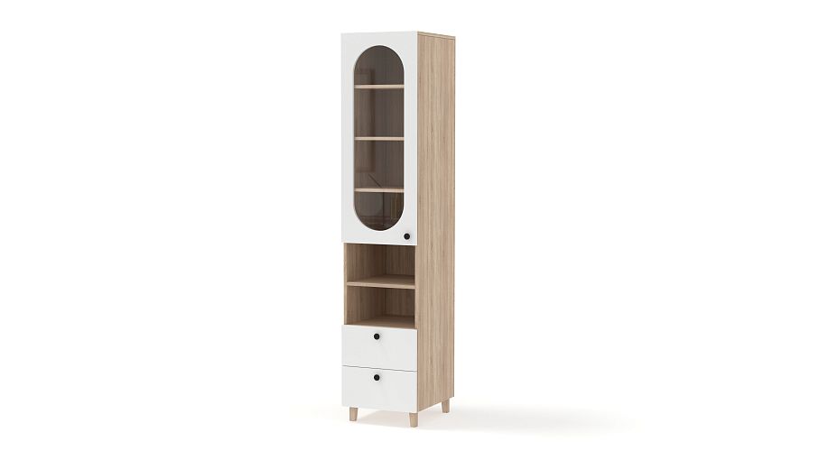 Шкаф-пенал Рене 3 BMS с витриной будет востребован в гостиной, детской комнате или столовой. Остекленное отделение, две открытые секции и два ящика позволят разместить на виду необходимые вещи и предметы декора, навести порядок в мелочах. Конструкция с высокими ножками визуально легкая, универсальный светлый фасад украшает овальный вырез. Купить шкаф-пенал Рене 3 BMS приглашаем в наш интернет-магазин с выбором размеров, фурнитуры и цвета по каталогу.
