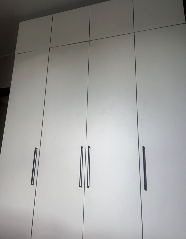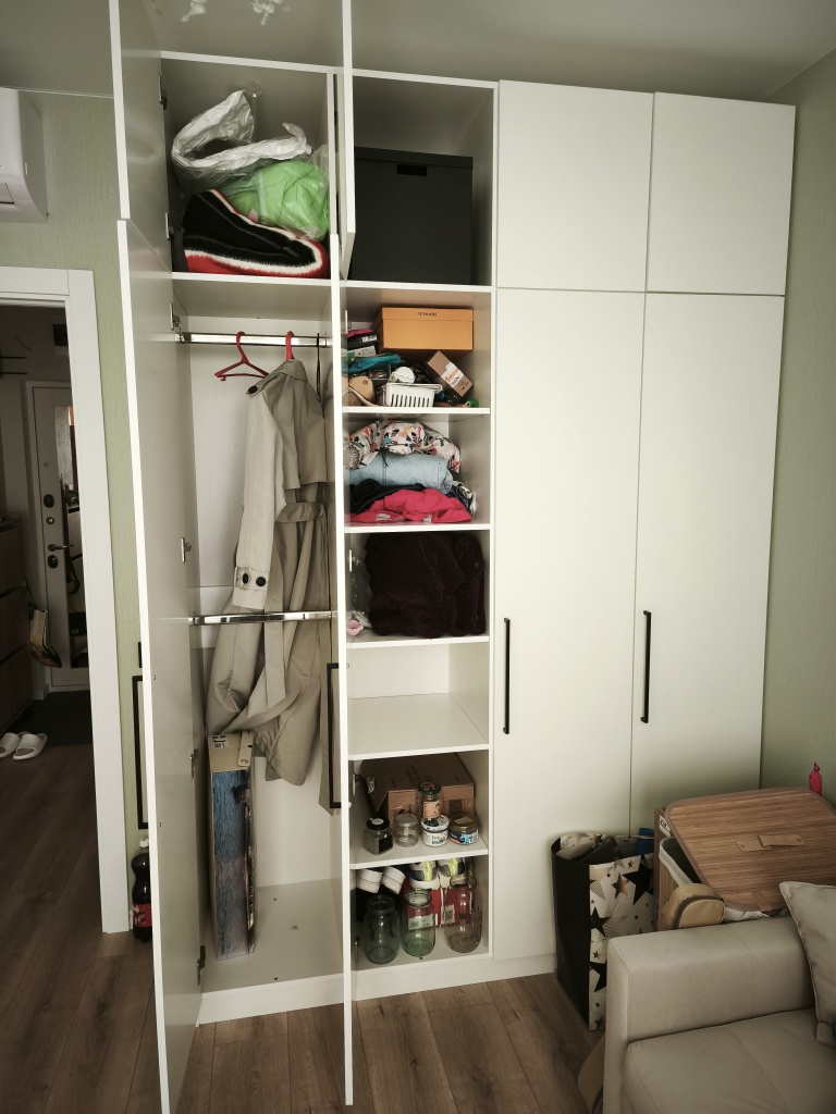 Шкаф покупали в прошлом году. Оформили в мебельном магазине лично. Мы внесли свои коррективы. Все ок. Когда доставили обнаружили, что положили разные ручки для дверей. Попросили заменить. Привезли на следующий день, но снова не такие. Решили уже забыть. (Брючницу на фото уже докупали сами)