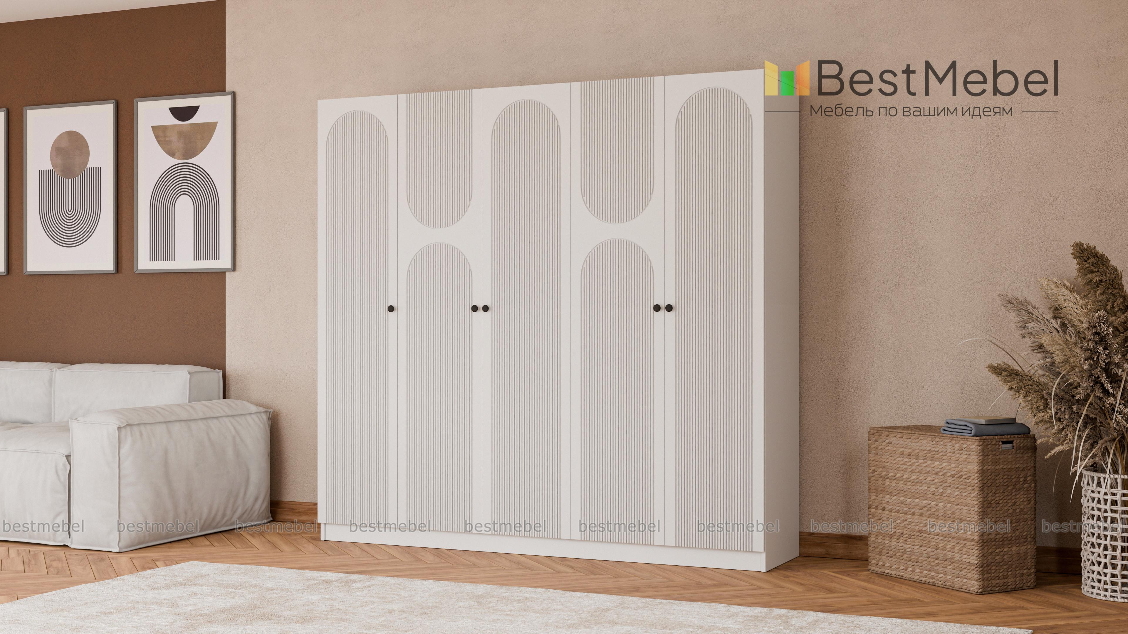Шкаф распашной Рене 31 BMS подходит для установки в спальнях, прихожих и детских комнатах. Вместительная пятидверная модель выглядит легкой за счет светлого фасада с изящным рельефом. Бельевые стеллажи и платяные штанги помогут компактно расположить вещи на вешалках, трикотаж и постельное белье, а распашные дверцы обеспечивают отличный обзор содержимому. Купить шкаф распашной Рене 31 BMS вы сможете в нашем интернет-магазине, подобрав размеры и цвет по каталогу.