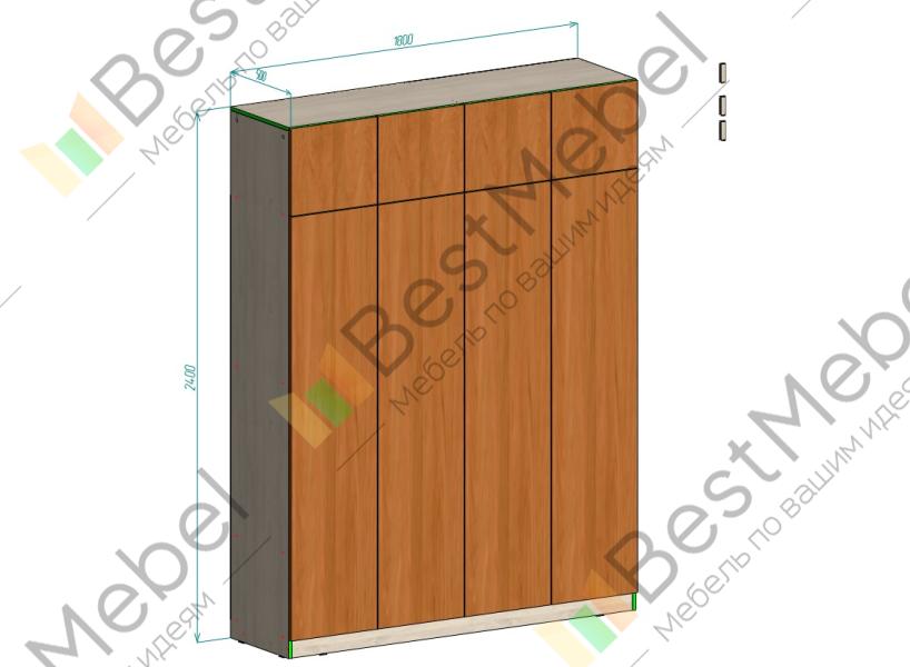 Шкаф распашной Руан 10 BMS - более вместительный по сравнению с аналогичными четырехдверными моделями благодаря антресоли. К основному отделению с двумя платяными секциями разных размеров и полками для белья добавлен дополнительный ярус сверху. Нейтрального цвета фрезерованные фасады - долговечные и достаточно универсальные, корпус выполнен из прочной ламинированной ДСП. Купить шкаф распашной Руан 10 BMS, изготовленный по вашим размерам, приглашаем к нам в интернет-магазин.