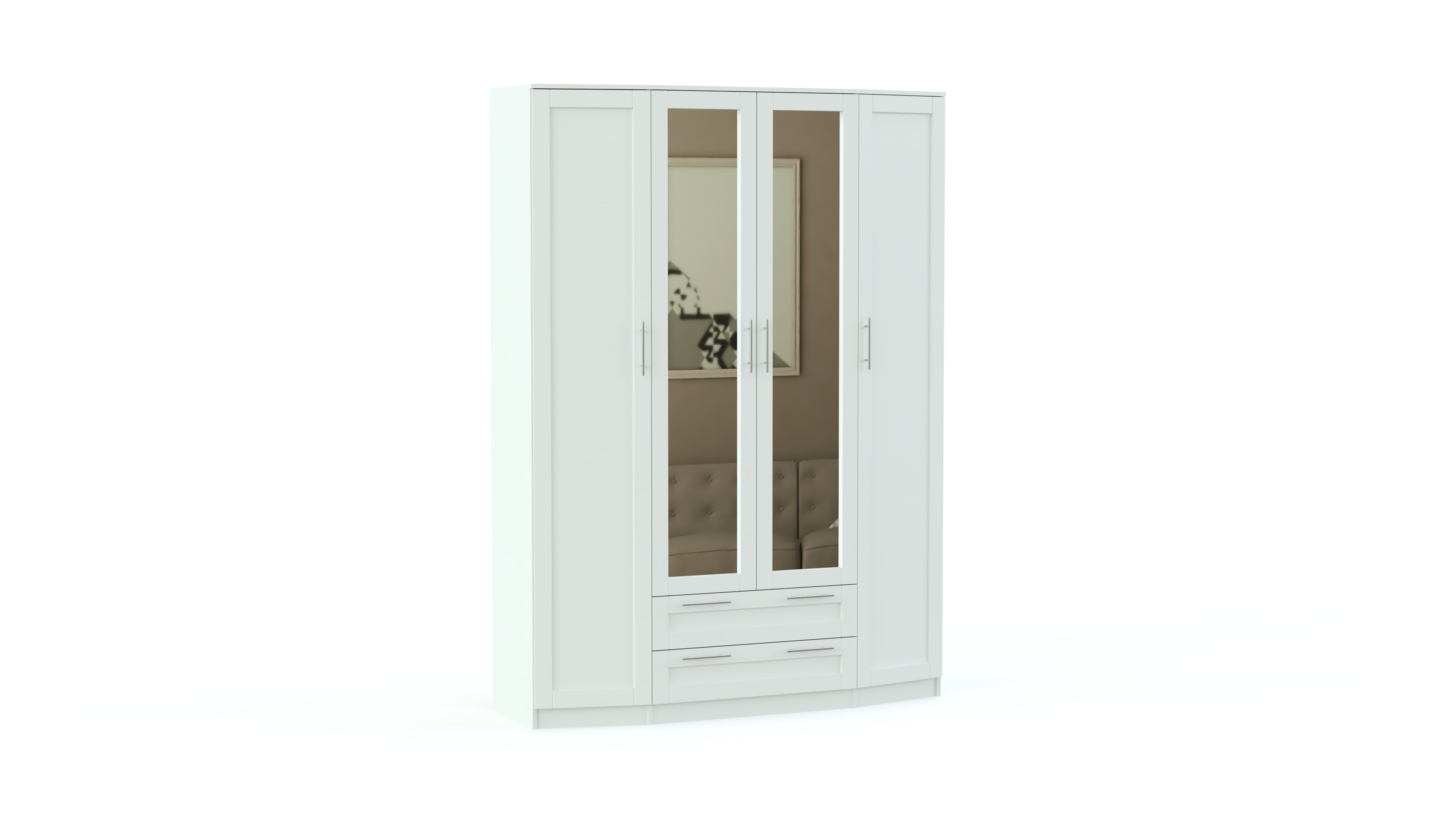 Стильная спальня Скандинавия BMS будет одинаково хорошо смотреться в современном помещении и комнате классического стиля. В ее оформлении удачно сочетаются простые формы, функциональность и интересный декор фасадов естественных древесных оттенков. В комплект входит состоящий из центрального с зеркалами и двух боковых скошенных элементов вместительный шкаф, удобный комод с навесным зеркалом, двуспальная кровать и две тумбы. Особенно выгодной покупка этого гарнитура будет в нашем интернет – магазине.