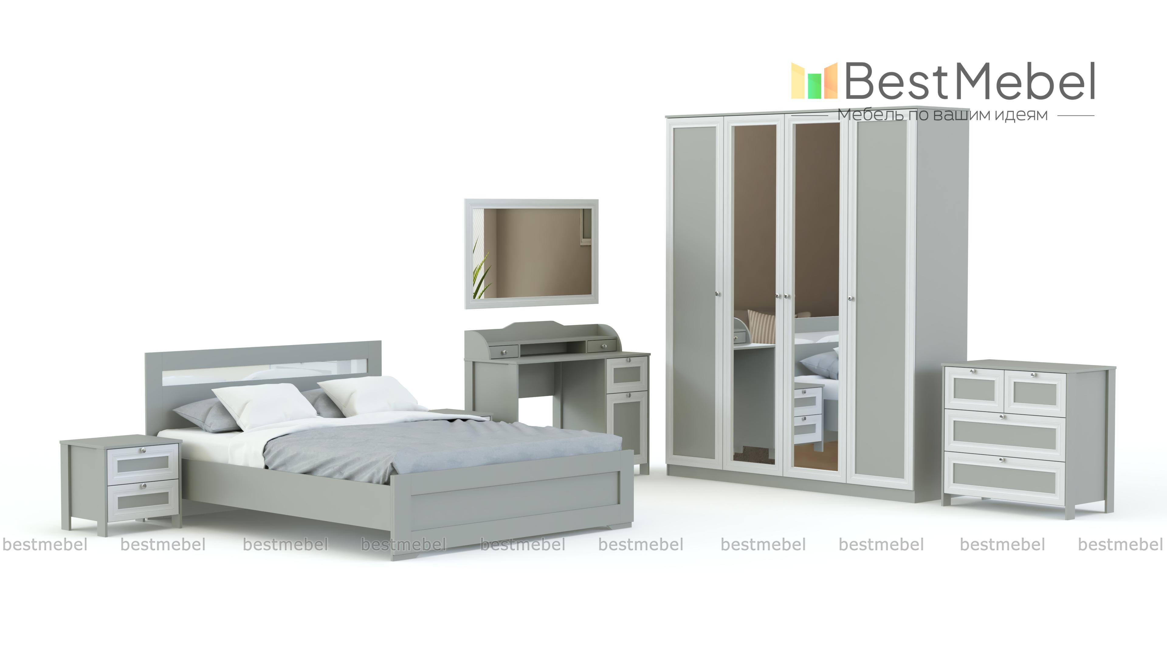 Элегантный классический комплект не выйдет из моды и прослужит вам долгие годы. Спальня Соната BMS состоит из нескольких модулей, которые удобно компоновать по своему вкусу. Это вместительный четырехдверный шкаф с зеркалами в полный рост, комод для белья и мелочей, туалетный столик с навесным зеркалом, кровать и прикроватные тумбы. Мебель выполнена в модных натуральных белых оттенках, а особенное изящество и легкость гарнитуру придают высокие ножки и металлическая фурнитура.