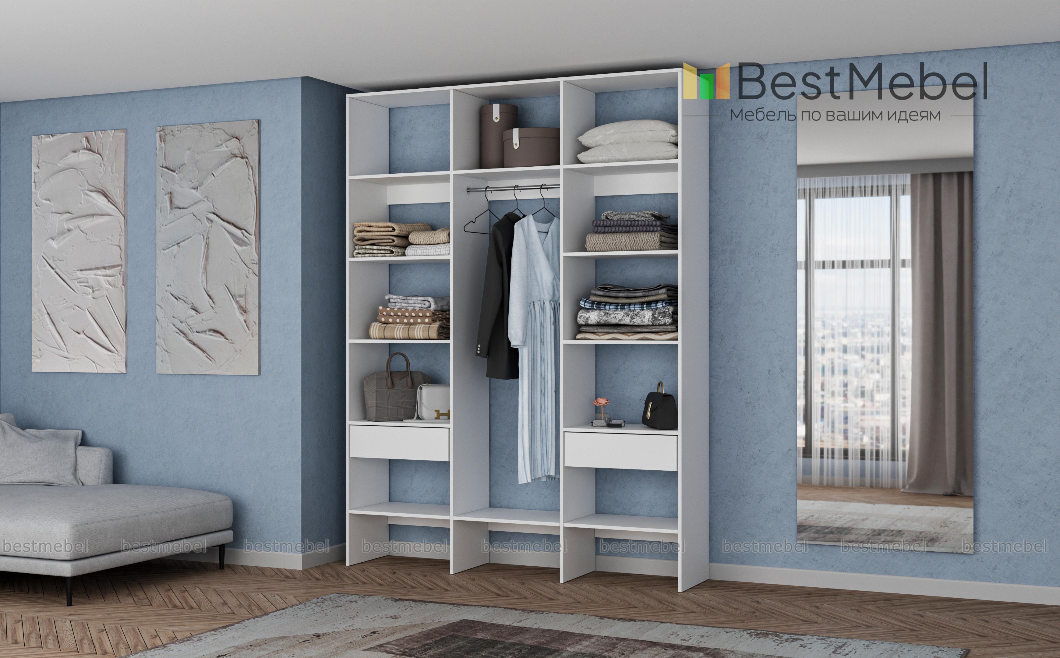 Стеллаж для одежды Мирта 14 BMS разработан специально для хранения в открытом доступе одежды, обуви и прочих предметов гардероба. В центре располагается отделение со штангой, а по периметру – открытые секции и два выдвижных ящика для мелких вещей. Визуально легкий и прочный, стеллаж выполнен из ЛДСП – износостойкого материала с широким выбором цветовых решений. Купить стеллаж для одежды Мирта 14 BMS, изготовленный по вашим размерам, вы всегда сможете на сайте нашего интернет-магазина.
