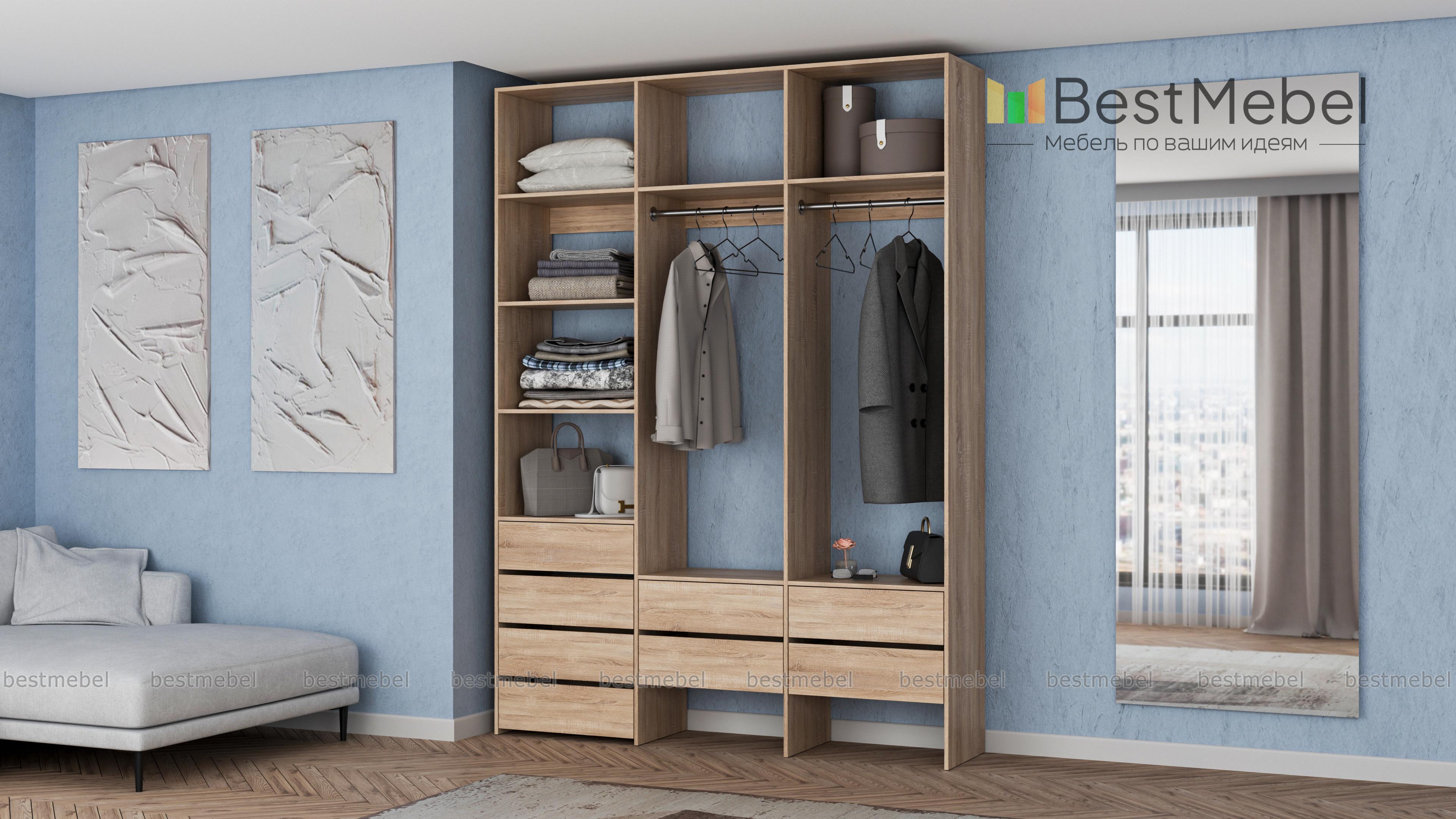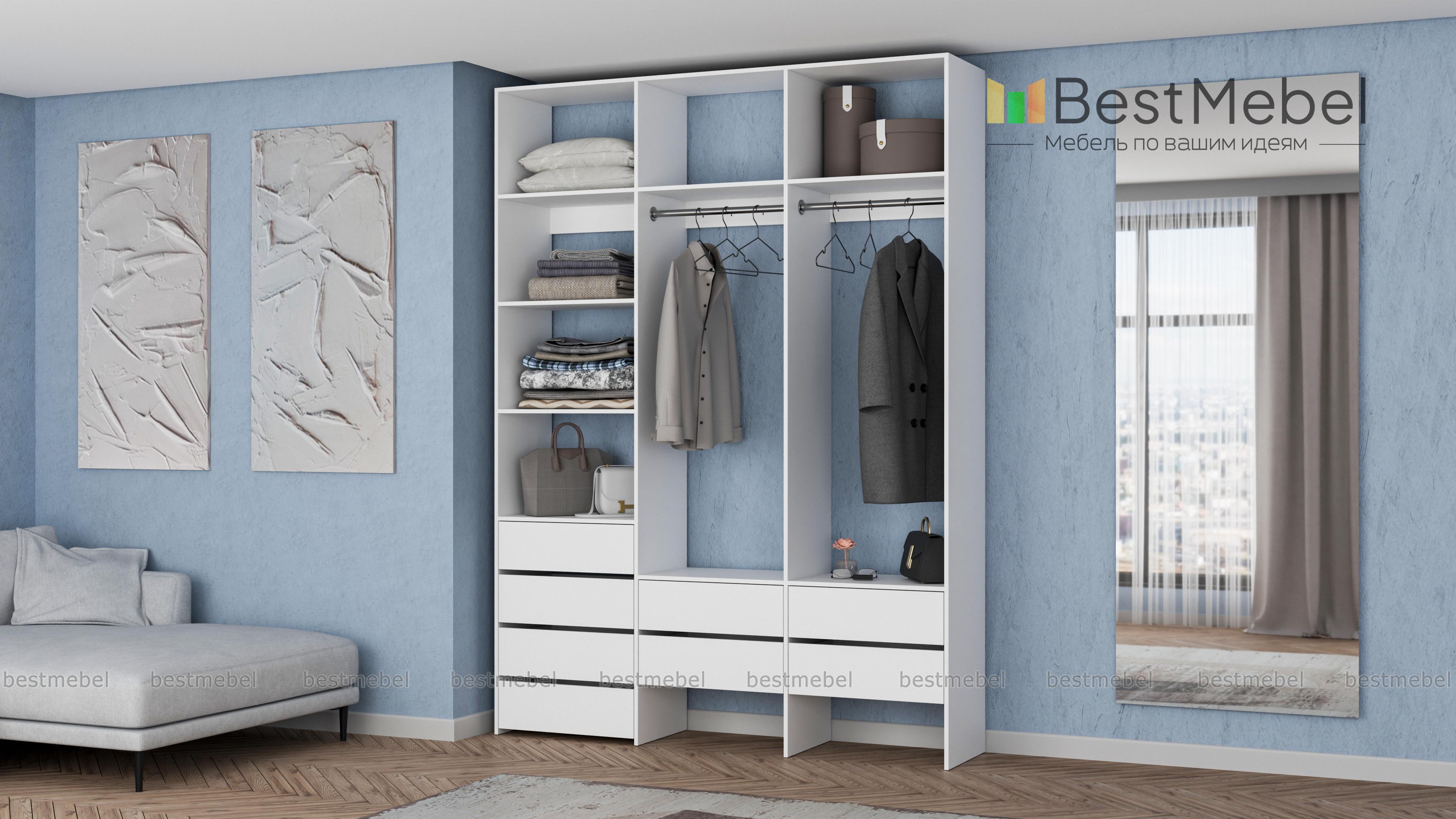 Стеллаж для одежды Мирта 54 BMS станет частью современной прихожей или гардеробной. Конструкция из ламинированной плиты имеет универсальный дизайн, надежна и функциональна. Система хранения трехсекционного стеллажа включает в себя две платяные штанги, ящики для белья и мелочей, ряд верхних и боковых полок, а пространство под ящиками можно использовать для размещения обуви. Купить стеллаж для одежды Мирта 54 BMS приглашаем в наш интернет-магазин, подобрав нужные размеры и цвет по каталогу.