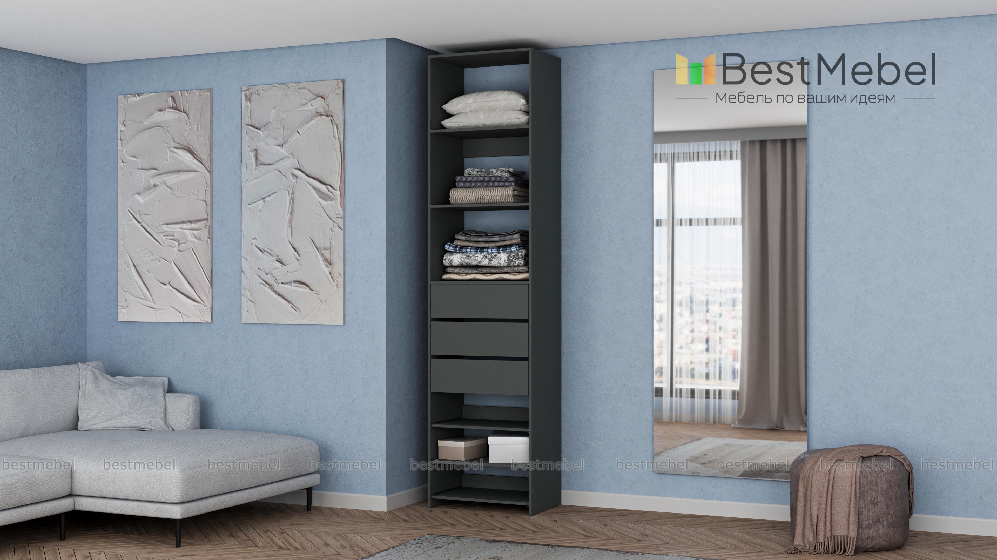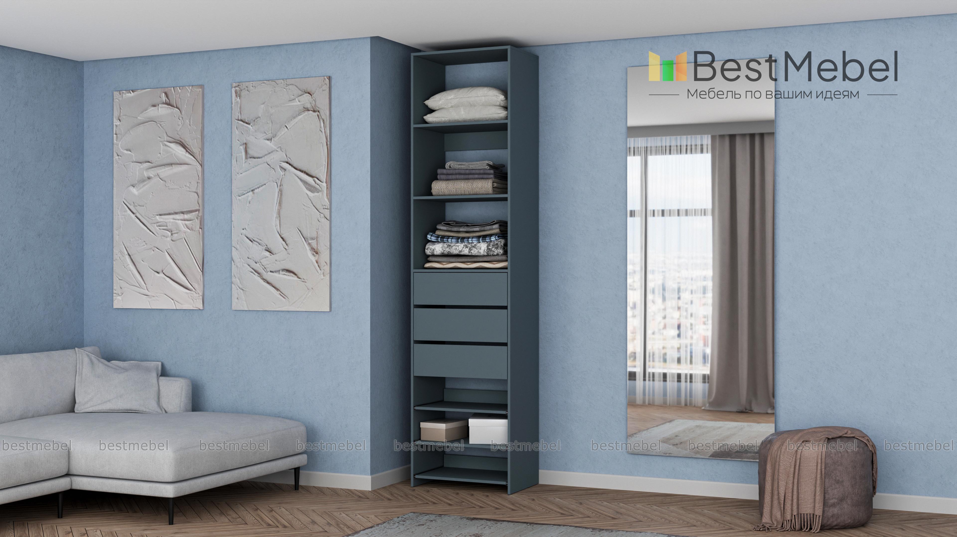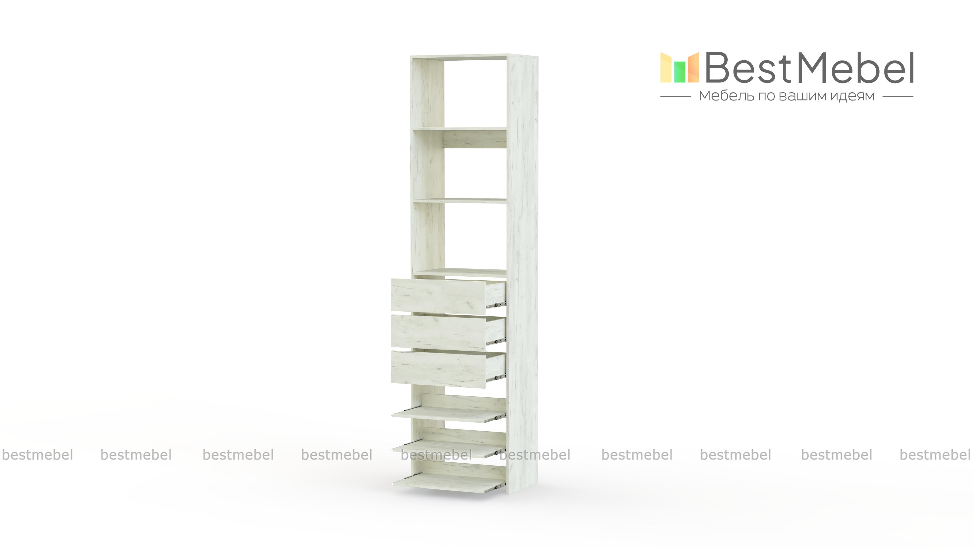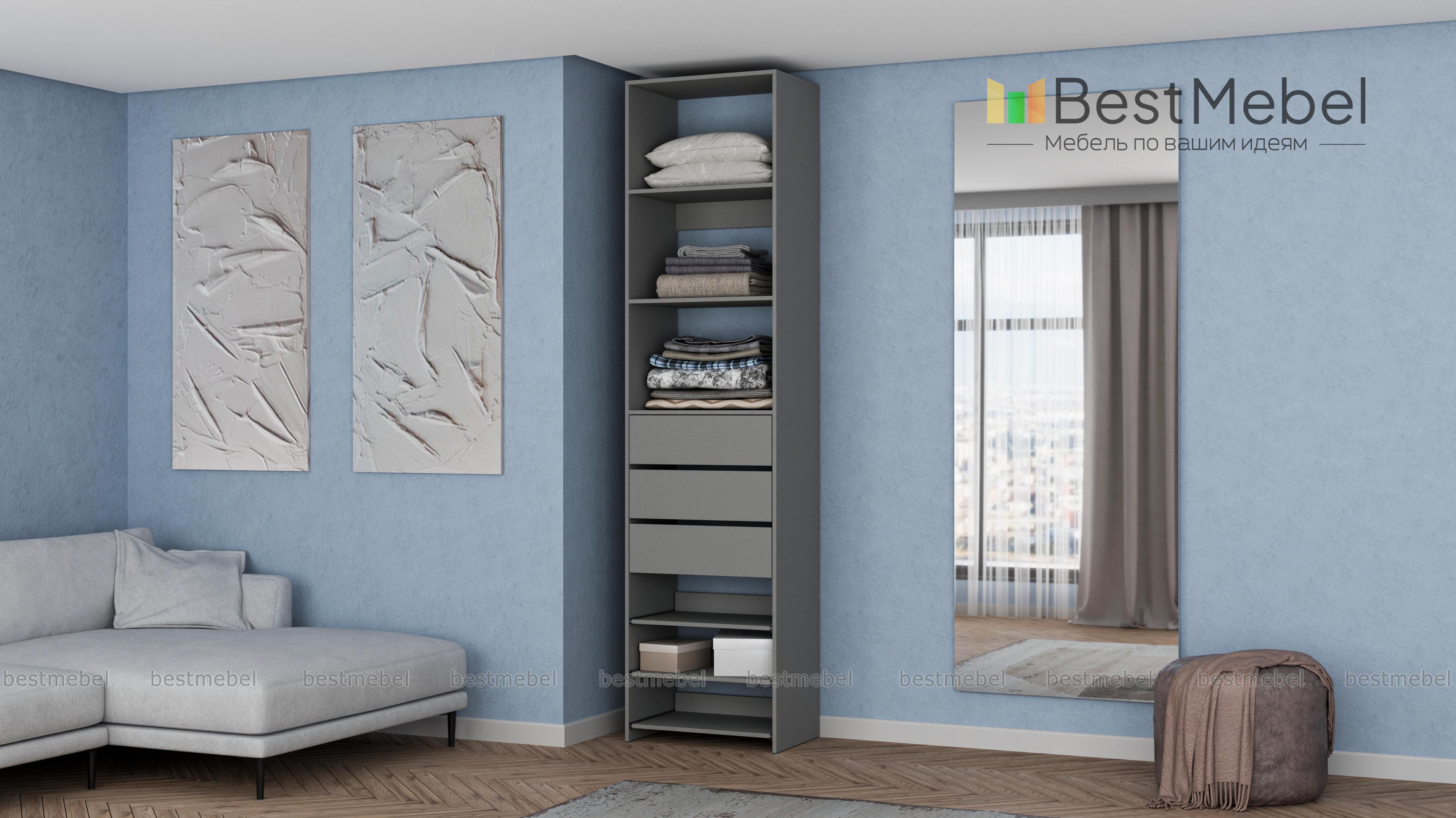 Стеллаж для одежды Мирта 77 BMS дополнит гардеробную систему или станет самостоятельным предметом меблировки. Односекционная модель оборудована тремя ящиками, стационарными и выдвигающимися полками для хранения одежды в сложенном виде, мелкого трикотажа, обуви и аксессуаров. Ламинированные поверхности влагостойкие и не требуют сложного ухода. Купить стеллаж для одежды Мирта 77 BMS, подобрав размеры и цвет под свой интерьер, можно на сайте нашего интернет-магазина.