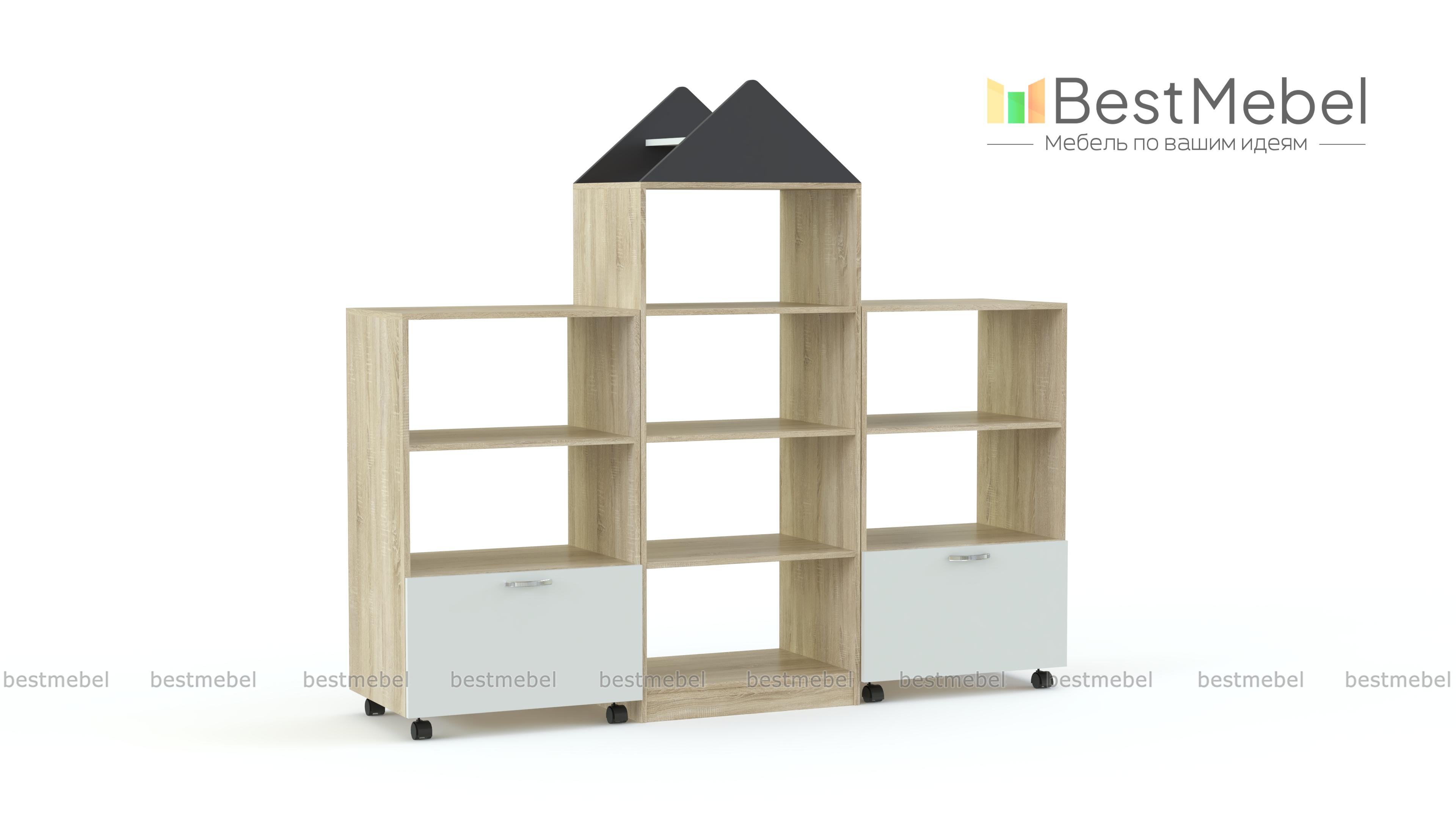 Стеллаж Тонкс 10 BMS состоит из напольного модуля в форме домика и двух мобильных стеллажей с колесиками, легко комбинирующихся друг с другом. Удобная система хранения включает в себя открытые полки для книг и учебных пособий и глубокие выдвижные ящики, в которых могут разместиться игрушки. Ламинированные поверхности стеллажа устойчивы к механическим воздействиям, не боятся влаги и просты в уходе. Купить стеллаж Тонкс 10 BMS вы сможете в нашем интернет-магазине с выбором фурнитуры и цвета по каталогу.