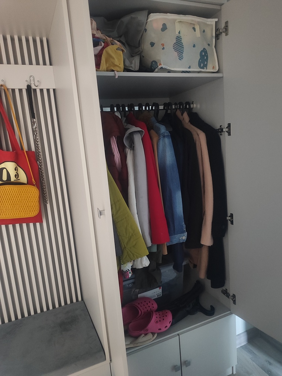 Заказ 00000989902. Шкаф "Остин Нео 16 BMS" мы брали в спальню, чтобы навести порядок с одеждой. Первое, что понравилось – возможность выбрать цвет. Взяли серый – смотрится очень стильно и современно, именно такой нейтральный, но не скучный оттенок, который мы искали. Черные ручки стали отличным контрастным акцентом, завершили вид. Сам дизайн действительно минималистичный и аккуратный, не перегружает пространство.Функционально шкаф оказался удобным. Три двери – хороший размах. Отделение для вешалок вместило все платья и костюмы, полки отлично подошли для футболок, свитеров и постельного белья. Распашная антресоль вверху – спасение для чемоданов и сезонных вещей, которые не нужны каждый день. Зеркало на центральной дверце – просто бомба! Очень удобно видеть себя в полный рост перед выходом, не бегая по квартире. И правда создает ощущение, что комната чуть больше.Но сборка... Сборка была испытанием.Деталей много, и самое сложное – установить вертикальные стенки (боковины и центральную перегородку) в одиночку. Это просто нереально. Они большие, тяжелые, их нужно держать строго вертикально и одновременно прикручивать. Без помощника тут никак, мы еле справились вдвоем. Еще один момент – петли. Их несколько типов (для обычных дверей и для зеркальной), и в инструкции не сразу понятно, какие куда. Пришлось искать видео сборки в интернете, чтобы разобраться – без него наверняка перепутали бы. Будьте готовы к этому этапу.Если вам нужен компактный, но вместительный шкаф с современным дизайном и полным зеркалом, и вы готовы к сборке (обязательно с помощником и, возможно, с обучающим видео под рукой), то "Остин Нео" – отличный вариант. Смотрится дороже своей цены, и теперь вся одежда наконец-то прибрана!