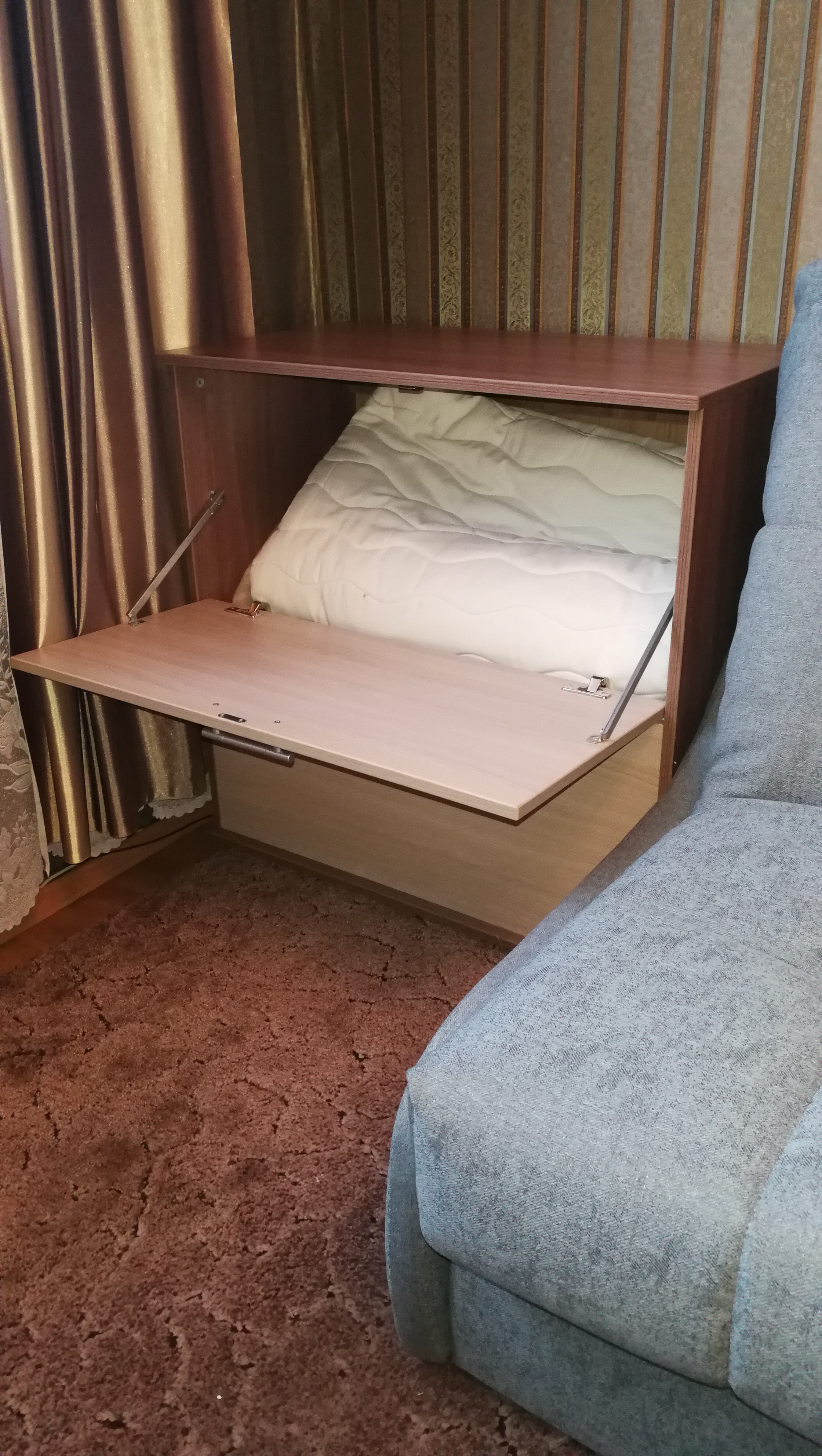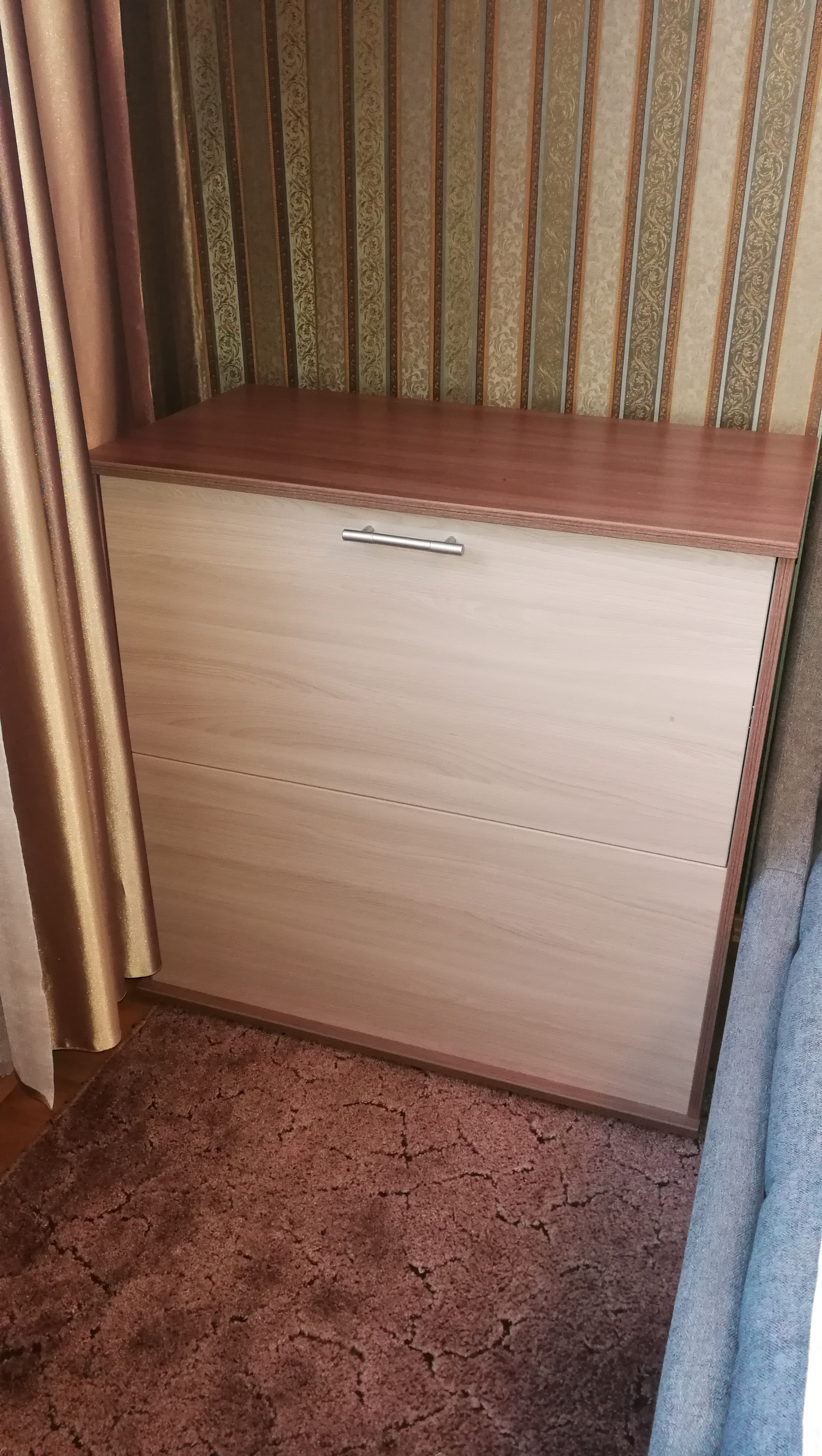 Положительно:Присматривал тумбу для белья (бельявица). Чтобы довольно вместительная была. Конечно искал с верхней загрузкой, но не нашлось. Остановился на модели КП-3, которая есть во многих интернет магазинах мебели. Цена везде одинаковая +-200р. Но выбор остановился на этом магазине, т.к. здесь можно изменять цвет, размер и фурнитуру изделия и другие параметры (кстати это здесь применимо к большинству мебели). В итоге подобрали цвет, выбрал толстую 2мм кромку по всем видимым деталям. Цена конечно выросла в основном из-за кромки, но оно того стоит. Отдельно такую кромку купить проблемно, чтобы самому приклеить.Получил заказ в указанные сроки.Кстати петли дали не простые, не те что были в заказе и вообще при выборе, но они с доводчиком оказались. Собрал тумбу без проблем. В стандартные размеры Ш820-В822-Г450 умещается толстое полуторное одеяло, две средние подушки, наматрасник Лисмарк 140*200 и еще немного места остается.Отрицательно:Был конечно скол покрытия 5*10мм на наружной плоскости дверцы. Но не стал заморачиваться с этим, его не так видно если не присматриваться (на фото можно увидеть справа в центре). Да и доказать брак или при моей сборке проблемно это. Может найду чем затереть скол в цвет...В комплекте идет механизм с фиксацией дверцы, но фиксация там не нужна, она же открывается вниз. При закрытии дверцы приходится делать два движения вверх, а бывает одна только отщелкнется, то приходится "поколдовать" чтобы закрыть. Сюда нужны обычные направляющие без защелки, или газлифты. Но к сожалению выбора/замены этой фурнитуры нет.В целом все устраивает. Главное возможность изменения параметров изделия у многой мебели.